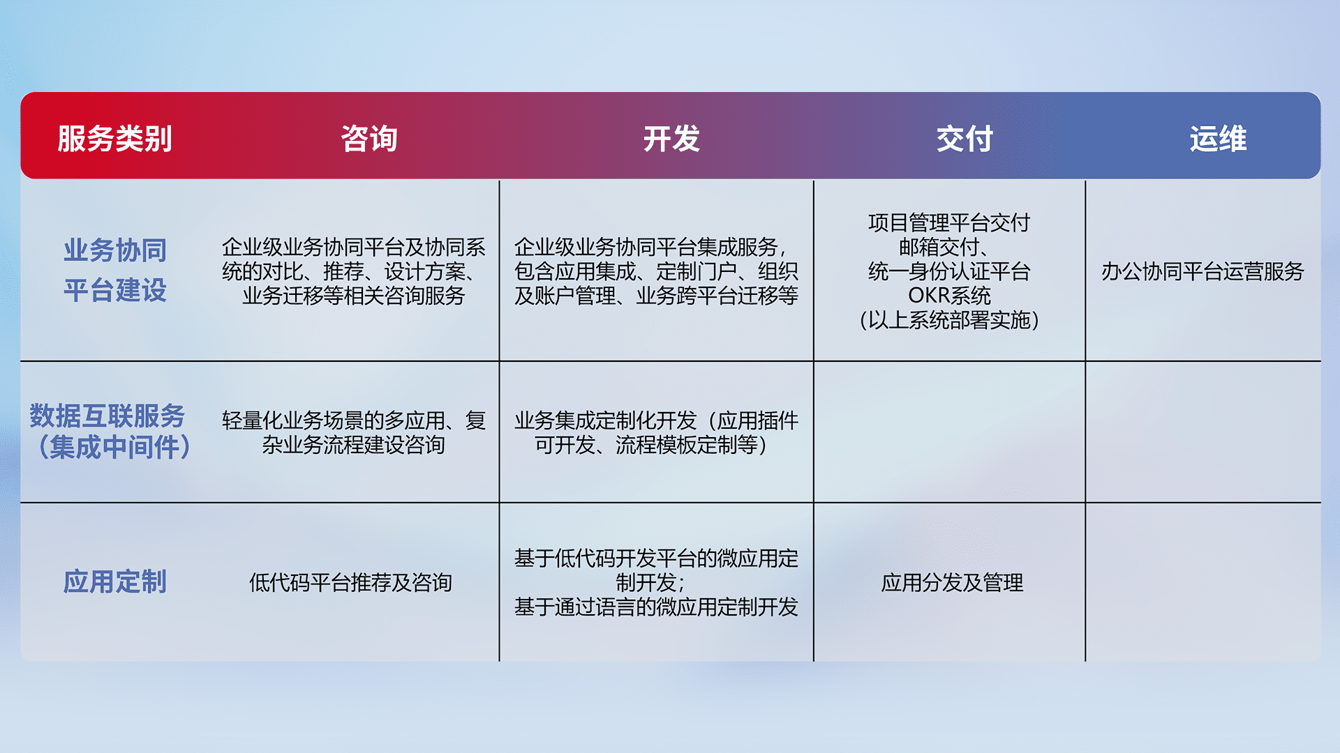 针对钉钉、、、企微、、、IDaas等平台级产品提供产品的规划、、方案、、、、交付、、定制化开发等服务,,,,实现如统一协同办公、、、智能客户服务、、、混合会议管理、、、、智能数据查询、、等业务场景,,实现数字化转型。。。